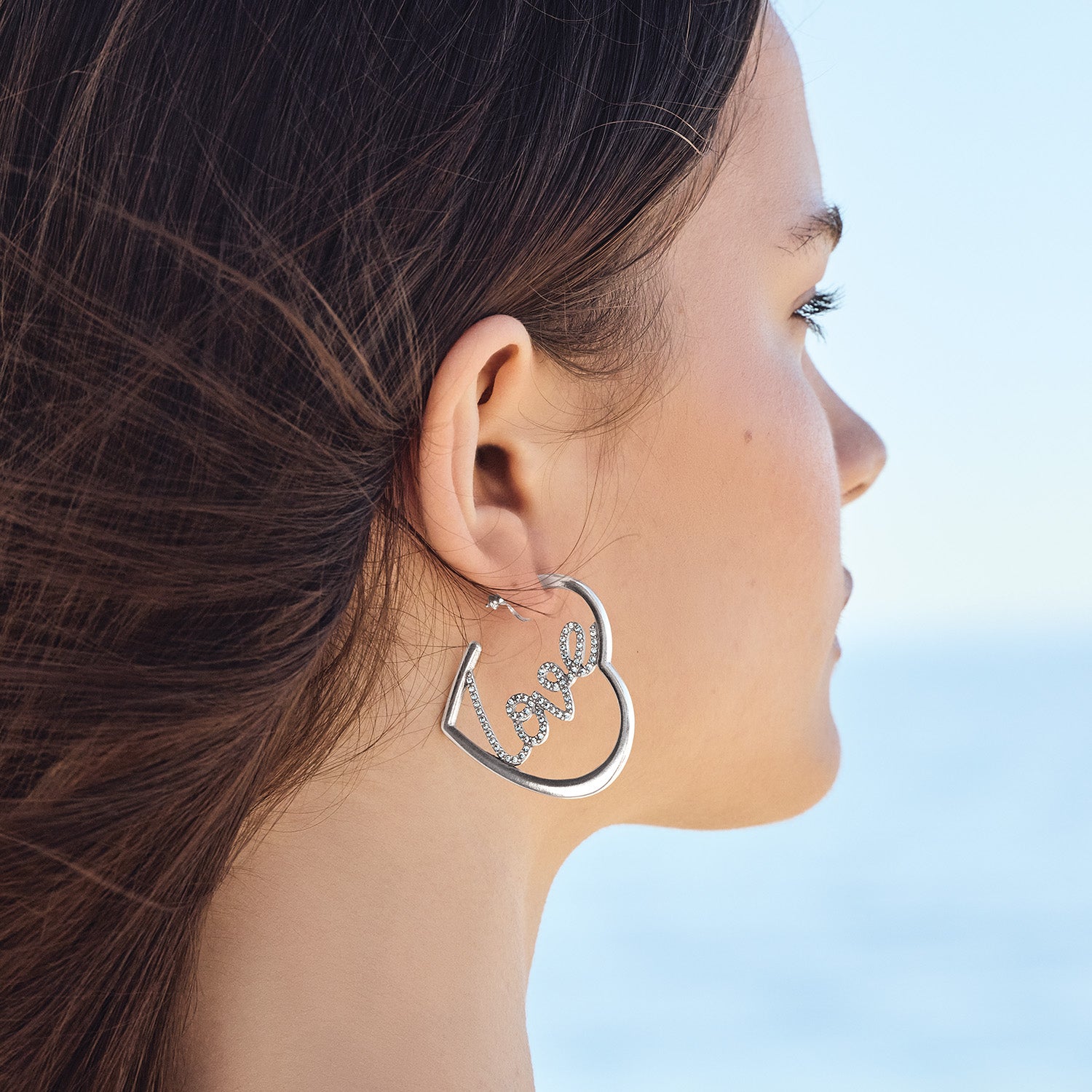 Aptly encircled with hearts, these love script earrings with shimmering pave crystals make a warm-hearted statement, and have a wonderfully modern design.
