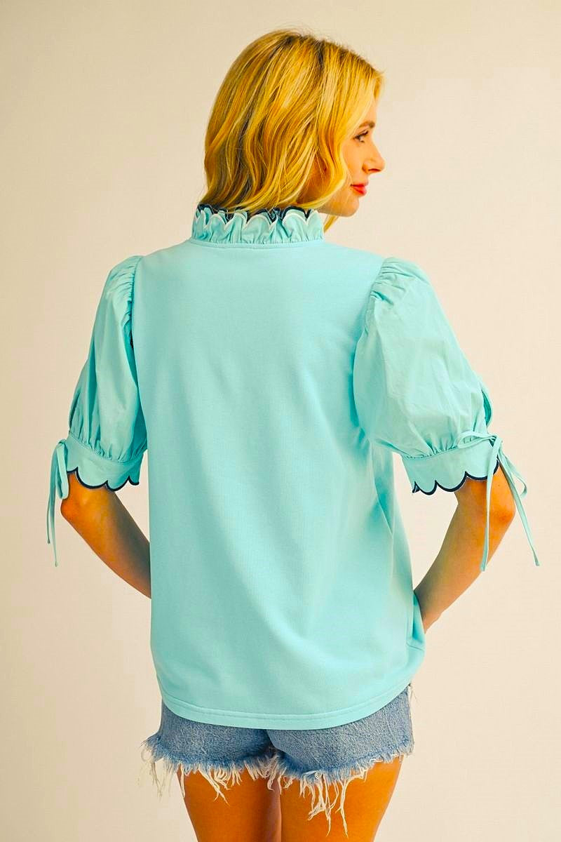 This breezy top is the definition of effortless charm. Designed in a soft aqua hue, it features a flattering V-neckline with delicate scalloped trim that adds just the right touch of femininity. The puff sleeves bring a playful, modern silhouette, finished with scalloped cuffs and subtle tie details for extra flair. Crafted from a lightweight, comfortable fabric, it drapes beautifully and feels easy to wear all day long. Perfect with denim shorts for a casual weekend look or dressed up with white jeans and sandals for brunch by the water.