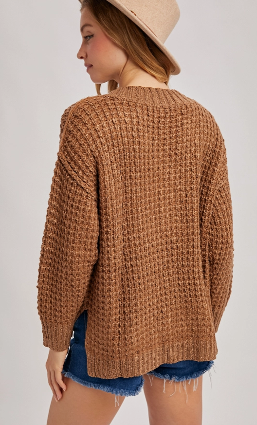 This sweater features a henley neckline, dropped shoulders, exaggerated buttons, and side slit details. The henley neckline adds elegance, while the dropped shoulders create a casual look. The standout feature is the oversized buttons, adding a playful touch. The side slits enhance the flow of the garment, while the high-quality knit fabric ensures comfort. Perfect for any occasion, this top effortlessly transitions from day to night. -Model is 5'9" and wearing a S/M