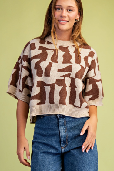 Elevate your everyday style with this effortlessly chic Abstract Sweater. Designed with a relaxed, boxy silhouette, this piece pairs modern artistry with cozy comfort. The eye-catching abstract pattern in warm neutral tones adds a touch of personality, while the wide short sleeves and slightly cropped hem create a flattering, easygoing shape.