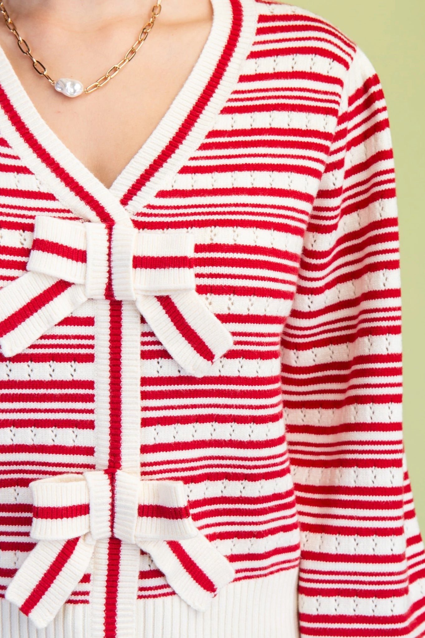 Sweeten up your style with this charming Bow Pullover. Featuring a playful red and white striped knit pattern, this cardigan brings a retro-inspired flair to your wardrobe. Two statement grosgrain ribbon bows adorn the front for a feminine, whimsical touch, while the deep V-neckline and wide ribbed hem create a flattering silhouette. The soft, breathable knit and slightly puffed sleeves make it perfect for layering in cooler weather or wearing on its own for a standout look.
