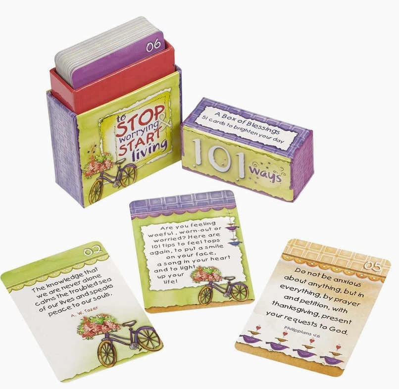 Show your support for a friend going through a challenging time with the 101 Ways to Stop Worrying & Start Living Box of Blessings. This Box of Blessings holds 51 double-sided cards with 101 messages to cheer you up when you are feeling down.