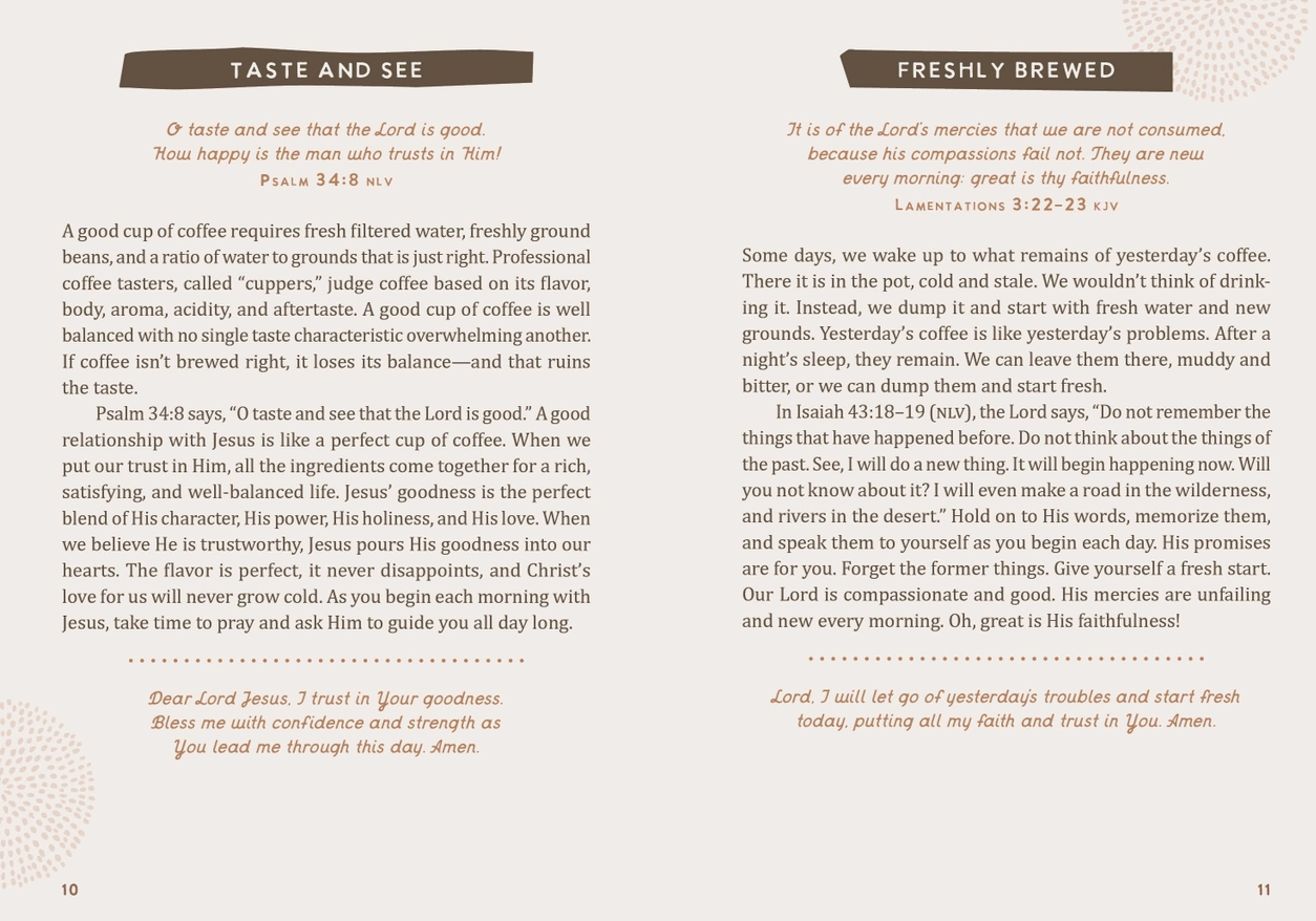 What's better than starting your day with a freshly brewed cup of coffee? Starting your day with coffee and Jesus! This delightful devotional encourages you to pour yourself a fresh cup of your favorite blend, cozy up in your favorite chair, and prepare your heart to savor soul-satisfying wisdom and encouragement. Each page features a robust brew of inspiring scripture, a powerful biblical truth, and a brief prayer to guide you into conversation with the one who loves you most. With Coffee and Jesus, you'll find your heart enveloped in the comfort and richness of God's holy Word. Features: 180 Inspiring Devotions and Prayers Attractive Colorful Interior Design Makes a Perfect Gift for Women Who Love Coffee and Jesus!