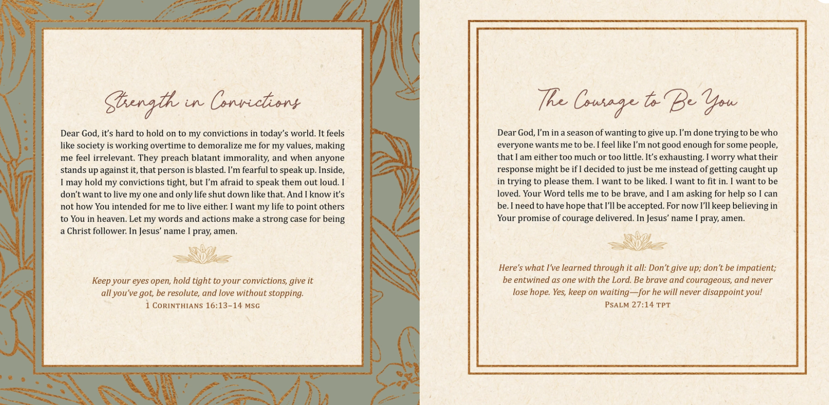 If you've ever felt overwhelmed by fearful thoughts. . . This lovely book will walk you through 200 encouraging, inspiring, heartfelt, courage-filled devotional prayers that will help your beautiful soul discover true trust and faith in Almighty God, the courage giver Himself. Every heartfelt prayer begins with a thought-provoking scripture selection and is meant to be a fear-free beginning to your very own personal prayer time. A courageous life. . .is just a prayer away!