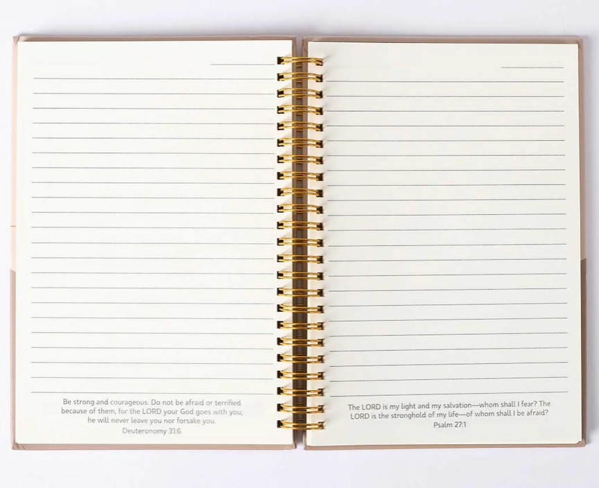Crisply lined pages with inspiring scripture verses at the bottom provide plenty of room to take notes, or process your thoughts. The sleek gold spiral and hard covers allow this journal to withstand daily wear and tear while allowing it to lay completely flat while open to either page.