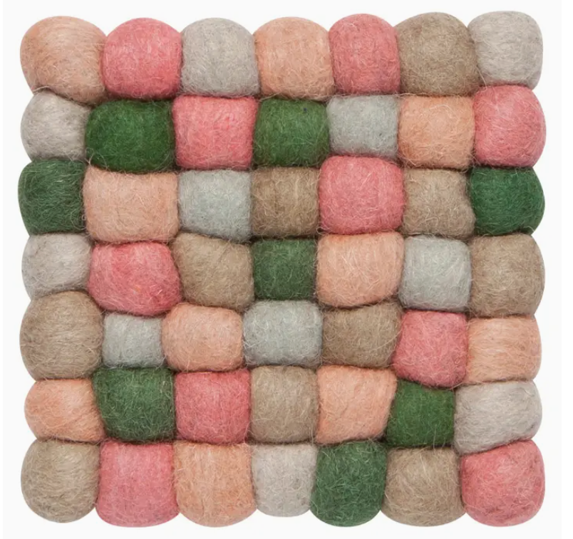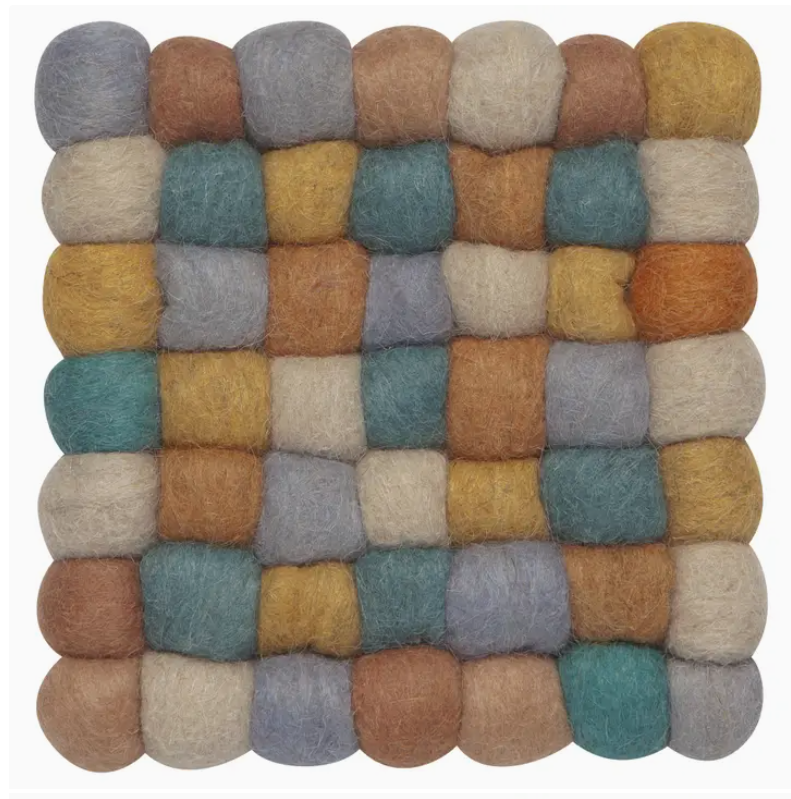 Ombre colors create a kaleidoscope pattern on these cozy woolen trivets. Each sphere is hand-felted and connected creating an unusual, textural statement for the kitchen or table.