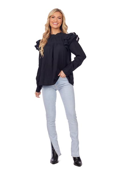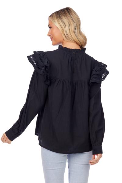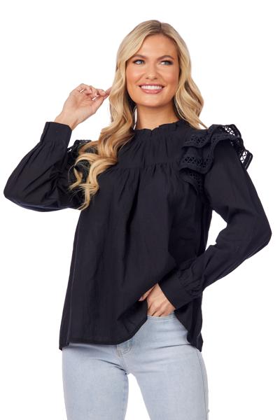 The Keller Ruffle Top is a stylish and versatile addition to your wardrobe. Made from high-quality cotton cambric, this top offers a comfortable and breathable fit. It features a charming ruffle neckline that adds a feminine touch to the overall design. Additionally, the top showcases lace trimmed shoulder ruffles, which elevate its aesthetic appeal. With a length of approximately 26" from shoulder to hem, this top is perfect for those who prefer a slightly longer silhouette. Whether you're dressing up for a special occasion or simply want to add a touch of elegance to your everyday look, the Keller Ruffle Top is a must-have