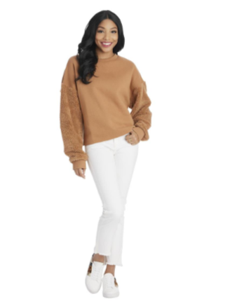 Wrap yourself in effortless comfort and style with this chic camel pullover. Designed with a classic crew neckline and a relaxed silhouette, this top is perfect for everyday wear. Its standout feature is the plush, textured sleeves that add a soft, cozy feel and a touch of elevated detail to an otherwise simple design.