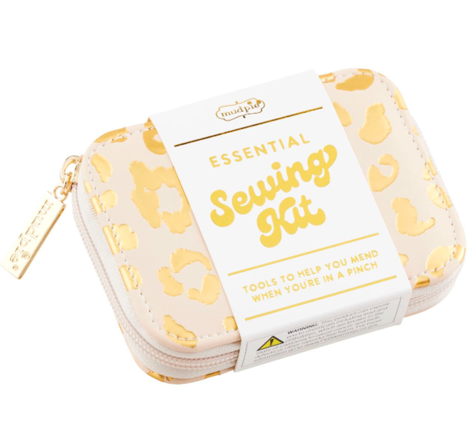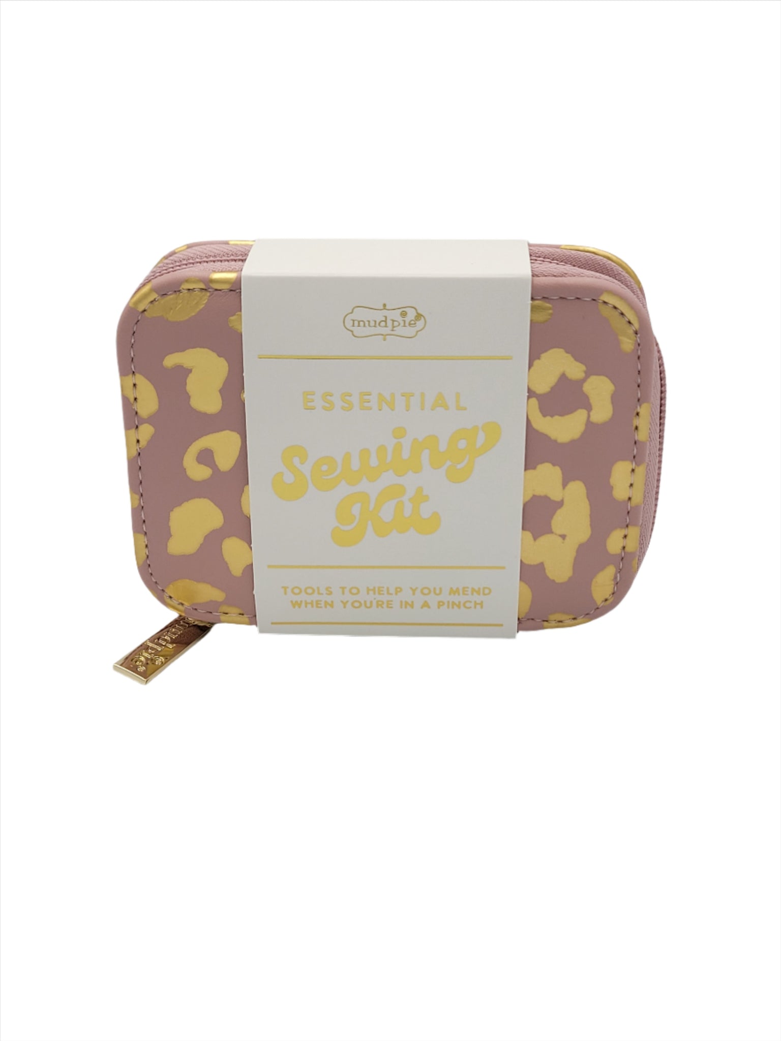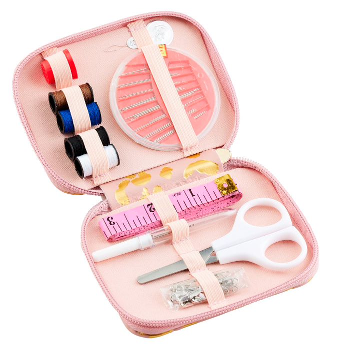 Foiled faux leather zipper case holds all the necessities for when you're in a pinch: measuring tape, thimble, set of assorted threads, seam ripper, pack of safety pins, scissors, pack of assorted needles and needle threader.