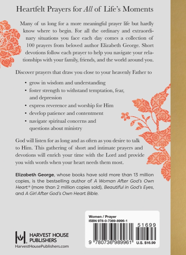 Heartfelt Prayers for All of Life’s Moments Many of us long for a more meaningful prayer life but hardly know where to begin. For all the ordinary and extraordinary situations you face each day comes a collection of 100 prayers from bestselling author Elizabeth George. Short devotions follow each prayer to help you navigate your relationships with your family, friends, and the world around you. Discover prayers that draw you close to your heavenly Father… • to grow in wisdom and understanding • for strength through temptation, fear, and depression • that express reverence and worship • for patience and contentment • concerning spiritual growth and ministry