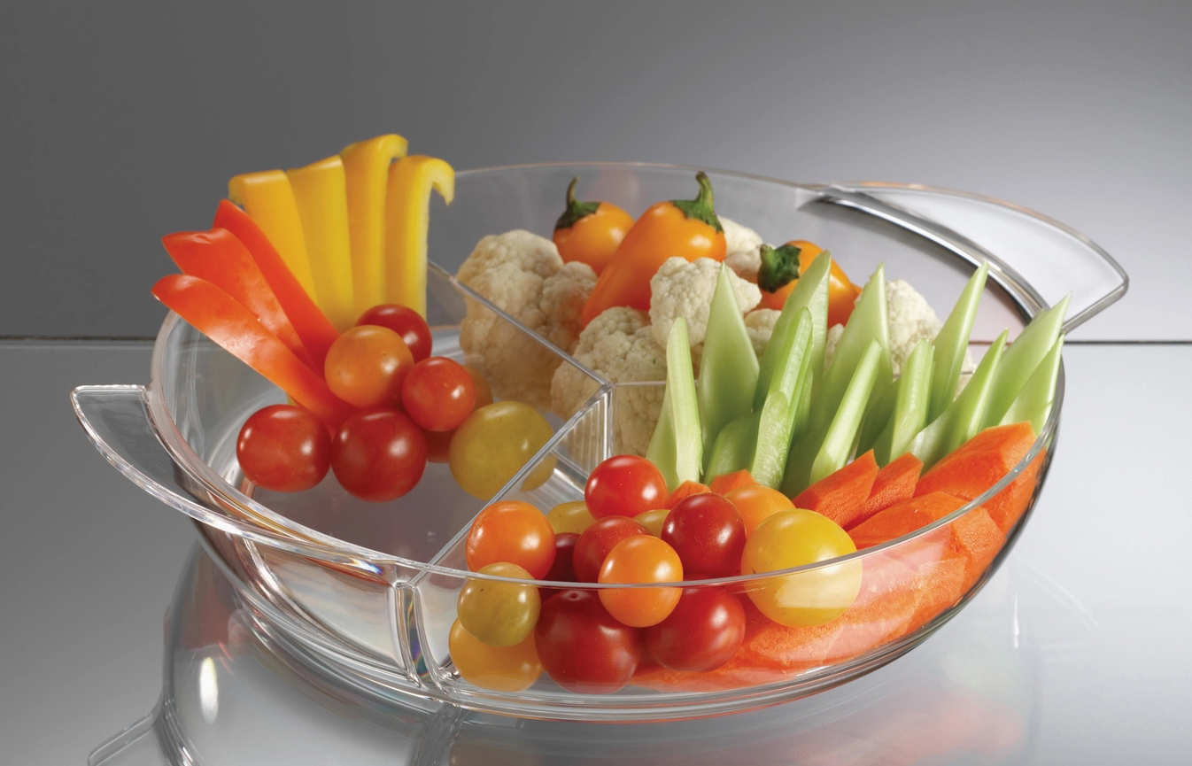 Food delights stay chilled and fresh on a bed of ice! \nThis attractive three-piece set features a vented upper food platter, a lower ice tray and a dome lid. Simply fill the bottom tray with crushed or cubed ice and position the vented upper food tray to allow the chill frrom the ice to flow through the food above. Perfect for indoor and outdoor entertaining. Crystal clear BPA free materials.