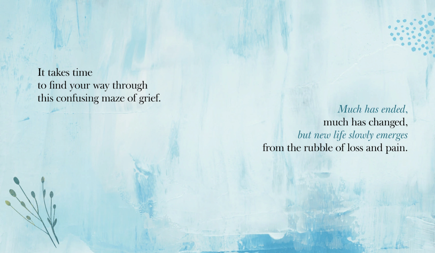 These short and simple reflections offer insight, empathy, and comfort to those who are grieving. “Give yourself permission to mourn, to feel your loss, to fully express your grief. . .”